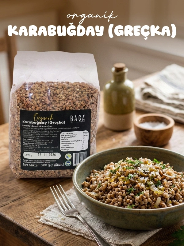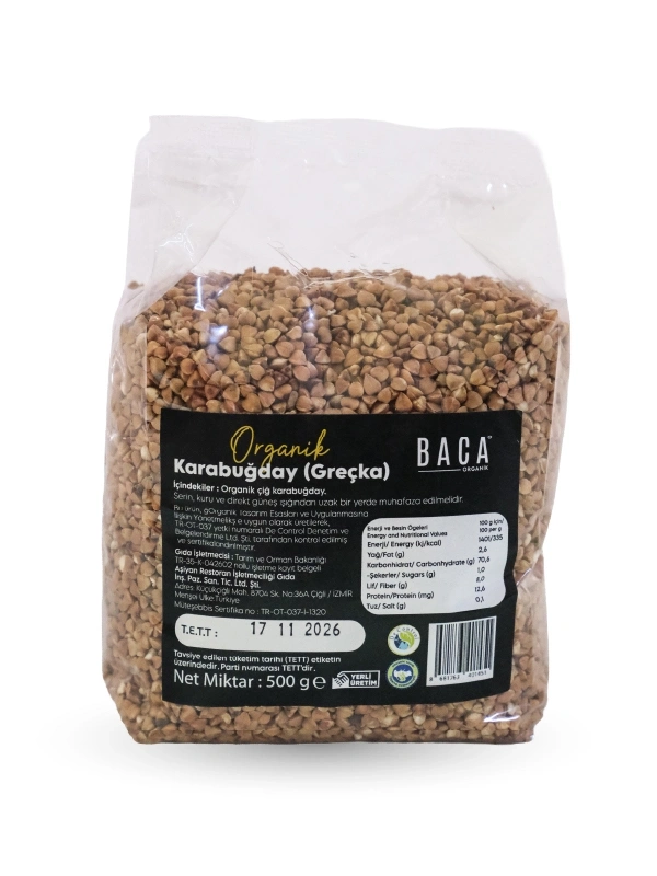 Baca Organik Karabuğday (Greçka),doğal tarım yöntemleriyle üretilmiş, katkı ve koruyucu içermeyen sağlıklı bir gıdadır. Gluten içermemesi sayesinde özel beslenme tercihleri olan kişiler için de uygun bir alternatiftir.